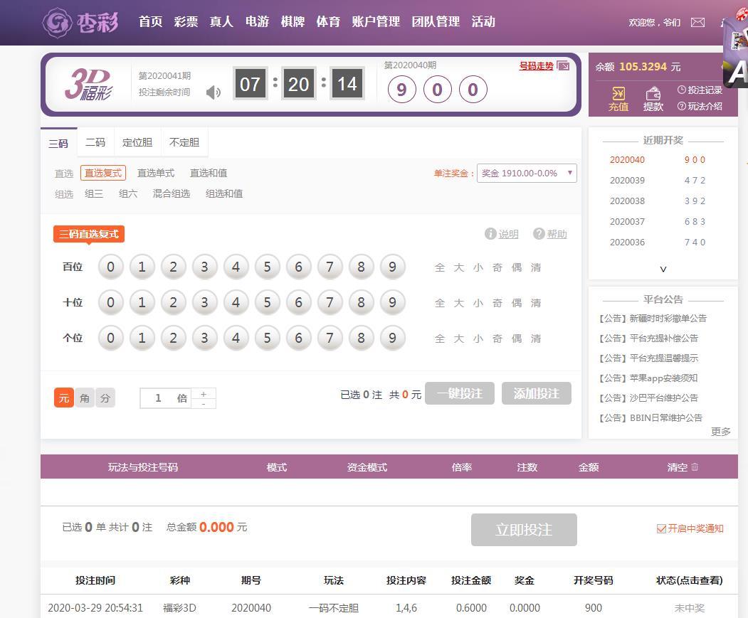 福彩3D投注失败。